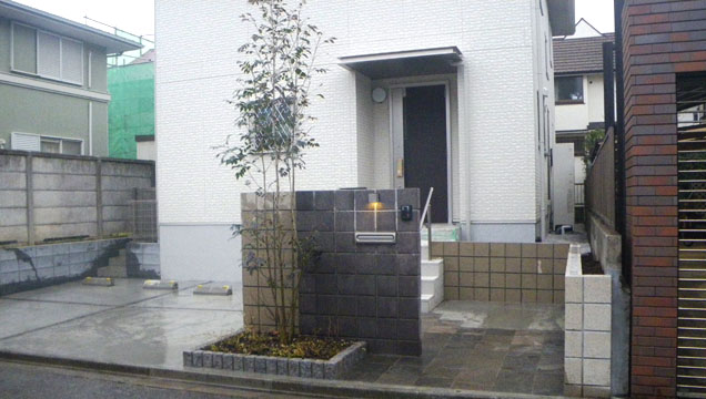 一般住宅の玄関先の部分で、枕木とブロック塀を使ったデザインでおしゃれに仕上げております。