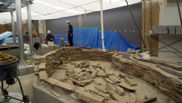 某空港内の池のオアシスの石を組む作業の様子です。